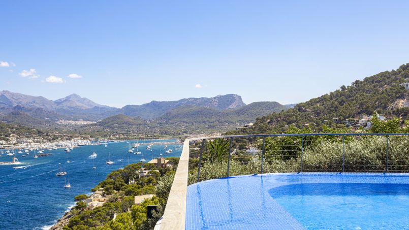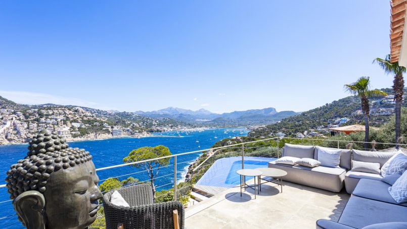 Siente la brisa marina mientras te relajas en la increíble terraza con vistas a la bahía de Puerto de Andratx.
