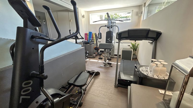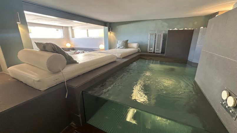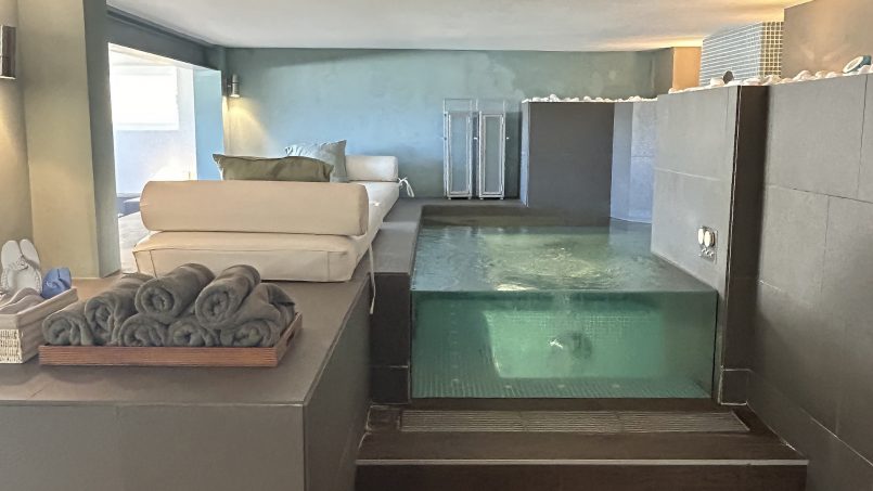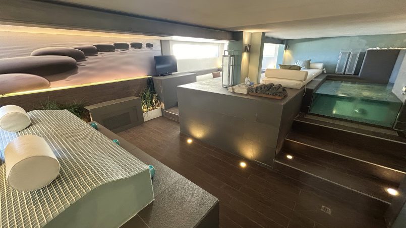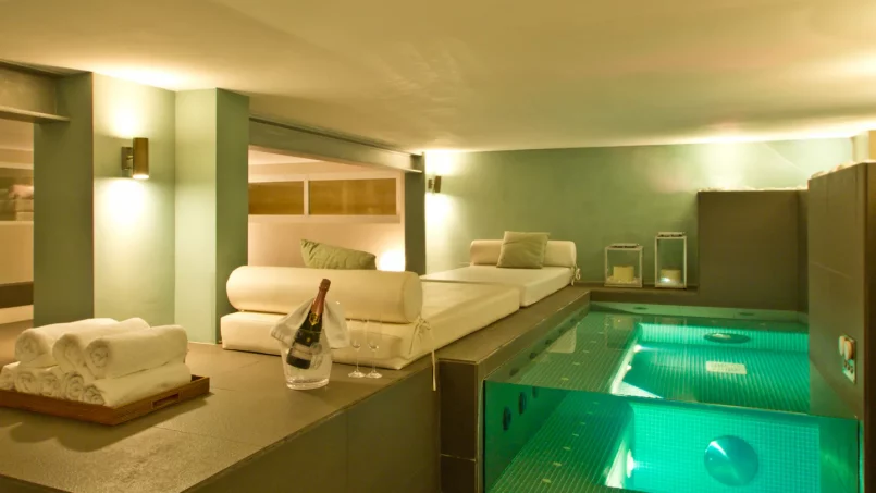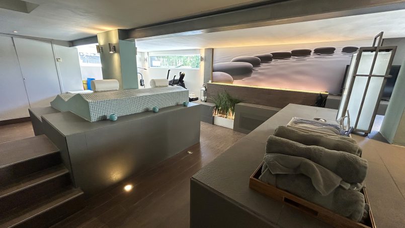 El moderno spa de 75 m² incluye un jacuzzi caliente (36-38°C) con ozonoterapia y varias opciones de masaje (cervical, lumbar, chorros de aire y agua), un baño turco de vapor con aromaterapia, una ducha de masaje, camas calefactadas, una zona de relajación, una camilla de masaje y un gimnasio totalmente equipado (máquina de pesas, elíptica, cinta para correr, máquina de remo, mancuernas y banco de abdominales).