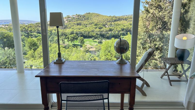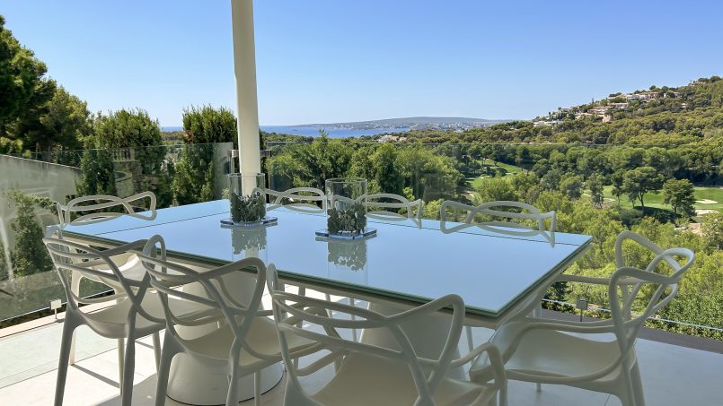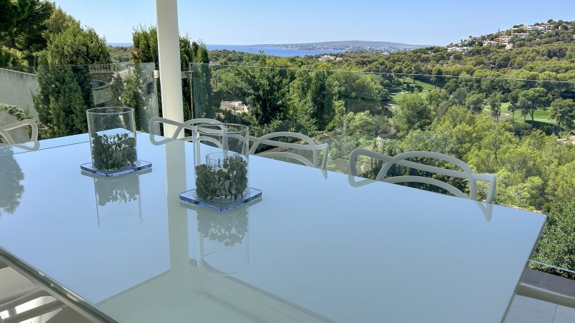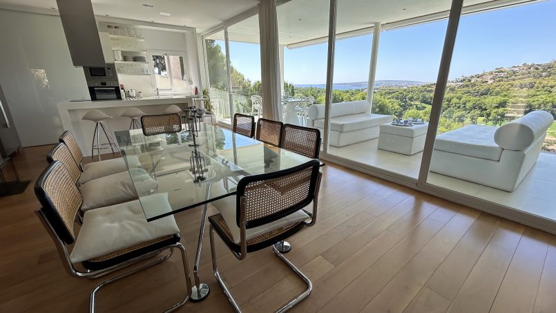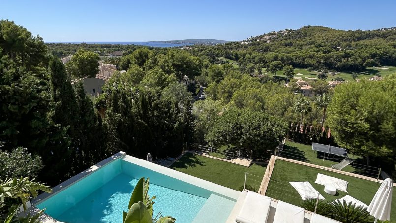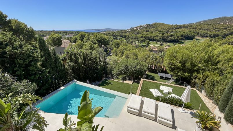 Lujosa y moderna villa con spa y piscina climatizada con vistas a la bahía de Palma y al campo de golf de Bendinat Esta impresionante y contemporánea villa ofrece vistas panorámicas de las montañas y el mar, con una ubicación ideal cerca del golf de Bendinat y a sólo unos minutos de Palma.
