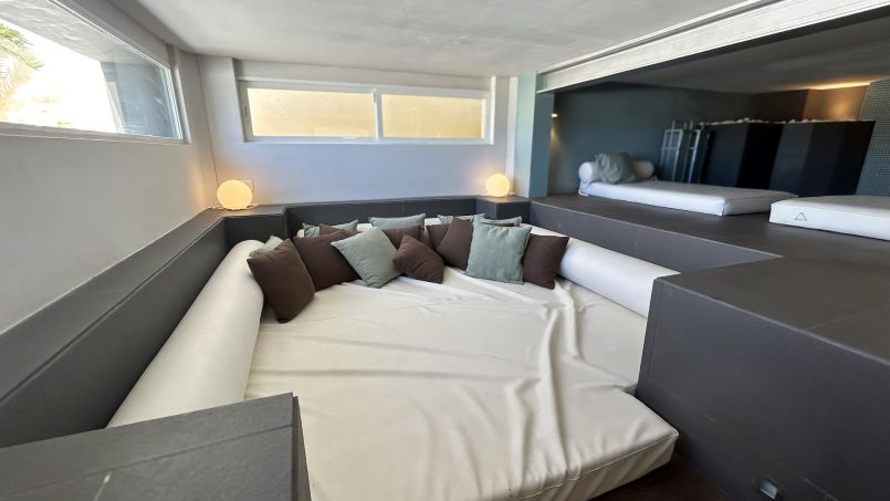 También hay una sala de estar secundaria cerca de la zona de dormitorios, que conecta con el lujoso spa de la planta inferior, así como con la piscina y el jardín.