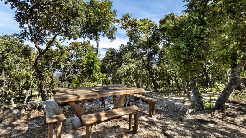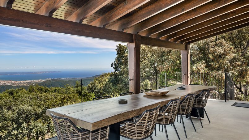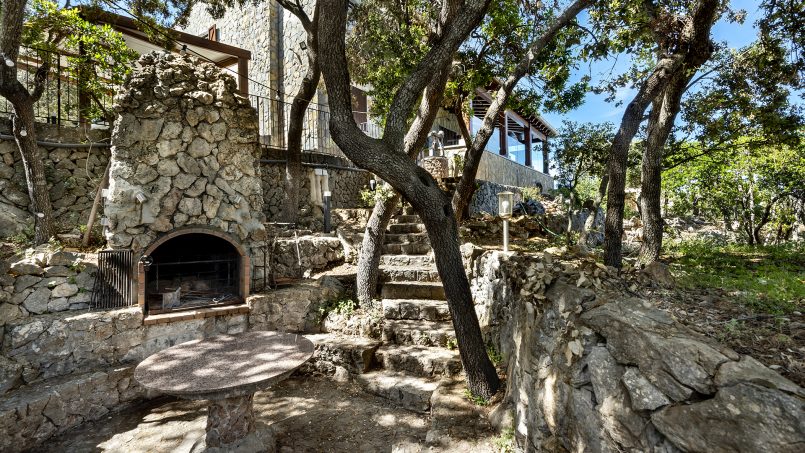 Rodeada de un bosque de robles de cuento de hadas, la villa está encaramada a una montaña encantadora, proporcionando una escapada serena del ajetreo y el bullicio de la vida cotidiana. Desde la terraza de la piscina y la impresionante piscina infinita, los huéspedes pueden deleitarse con unas vistas extraordinarias, mientras que el auténtico porche con vigas de madera invita a relajarse y disfrutar del impresionante paisaje.