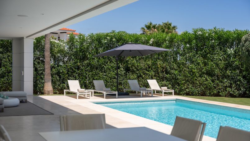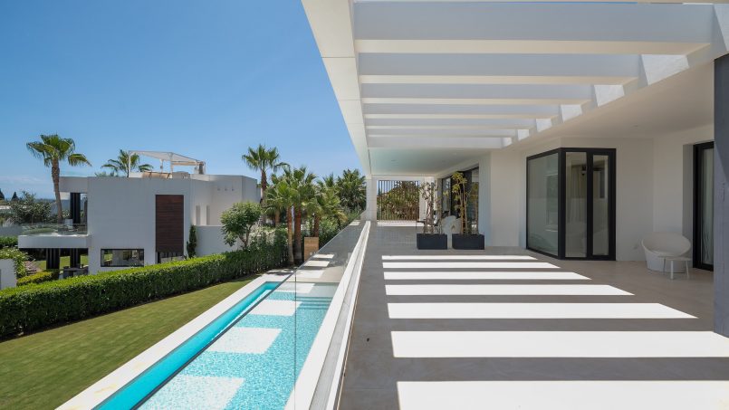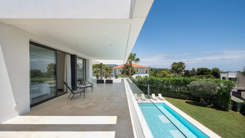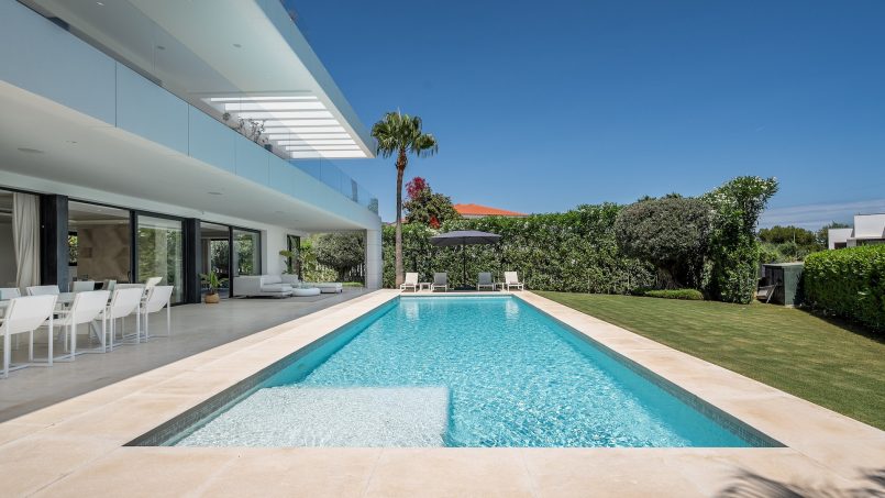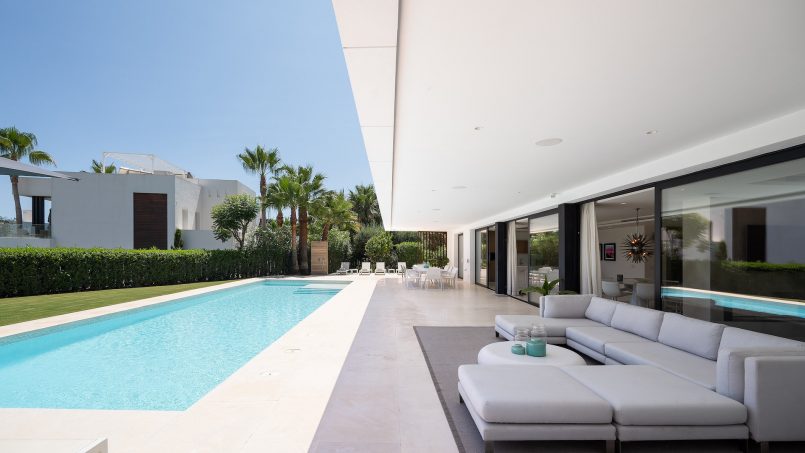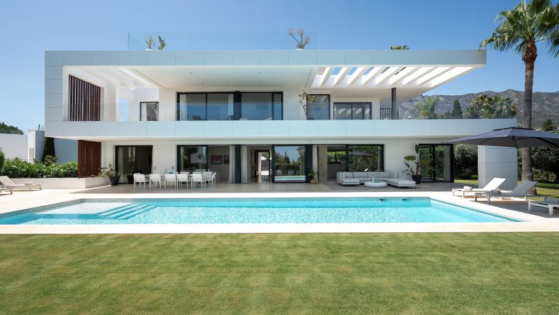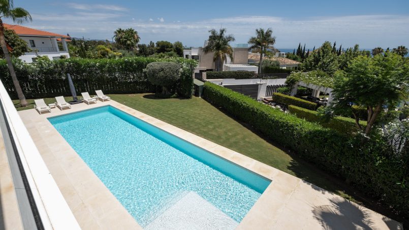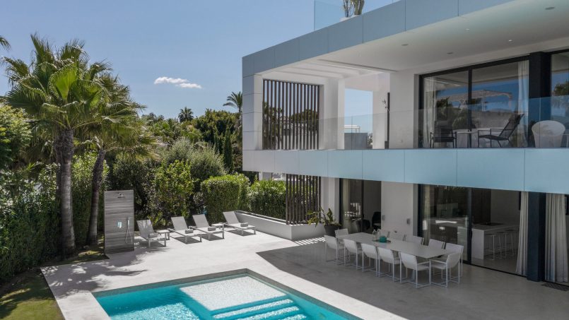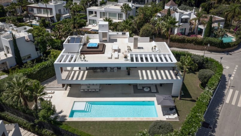 La Villa se construyó en 2017 y tiene un diseño moderno, casi futurista. El azul brillante de la piscina resplandece majestuosamente, reflejando las deslumbrantes paredes blancas de la villa, y deja una duradera impresión de estilo. Aquí podrás disfrutar de tu propio pequeño mundo de vida marbellí de superlujo, con impresionantes vistas al mar y una ubicación muy solicitada en Altos de Puente Romano.