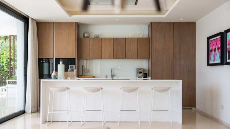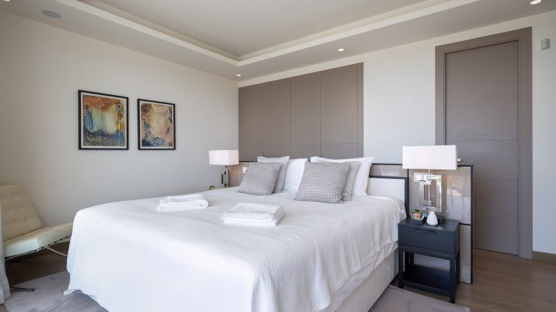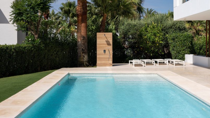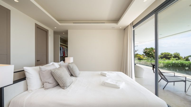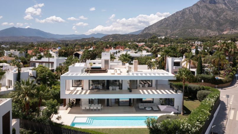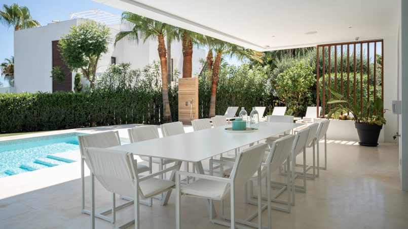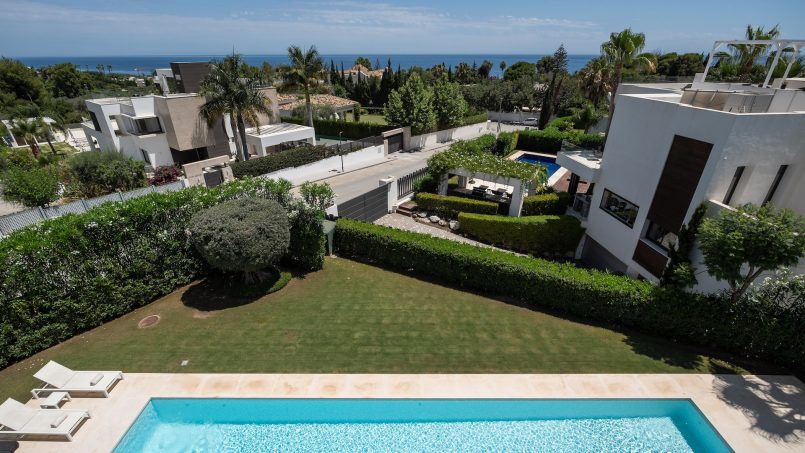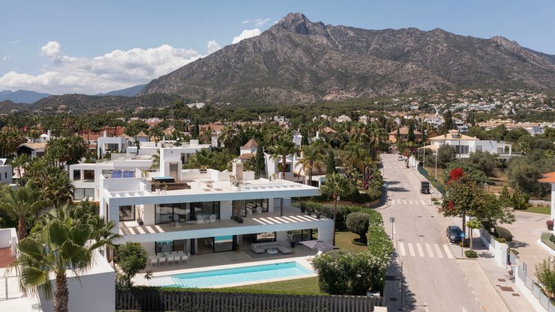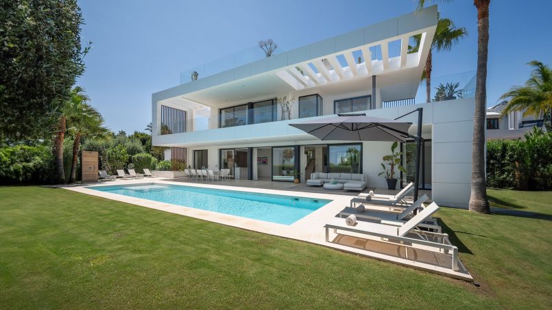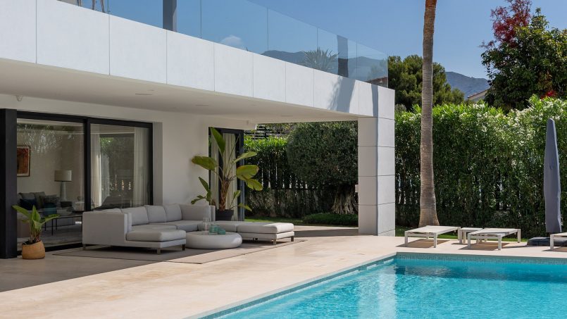 La Villa se construyó en 2017 y tiene un diseño moderno, casi futurista. El azul brillante de la piscina resplandece majestuosamente, reflejando las deslumbrantes paredes blancas de la villa, y deja una duradera impresión de estilo. Aquí podrás disfrutar de tu propio pequeño mundo de vida marbellí de superlujo, con impresionantes vistas al mar y una ubicación muy solicitada en Altos de Puente Romano.