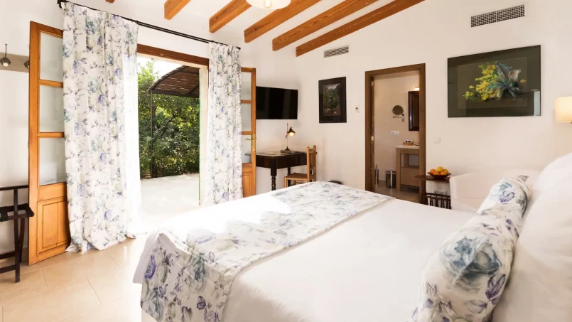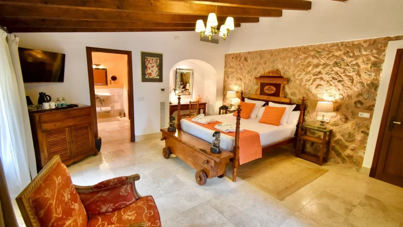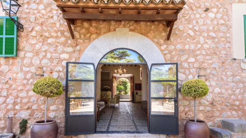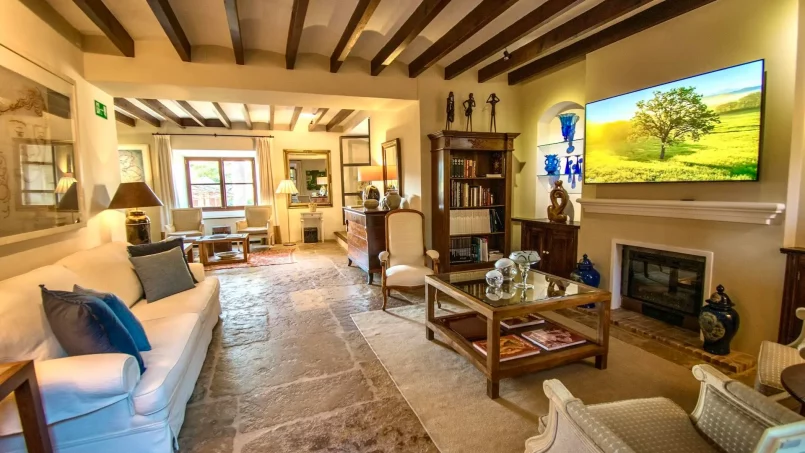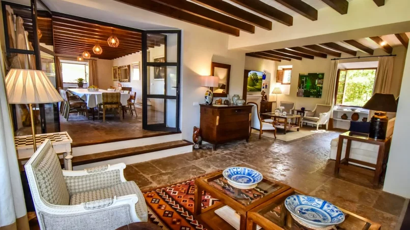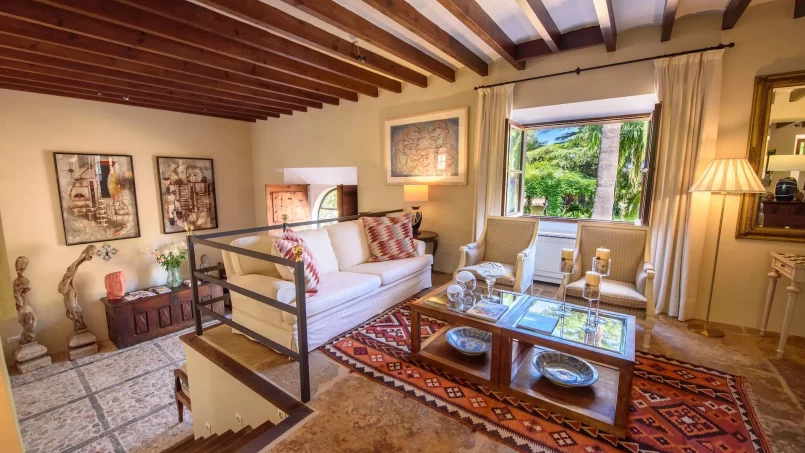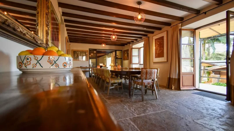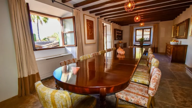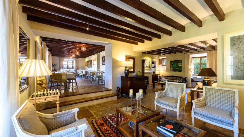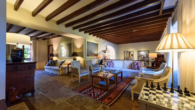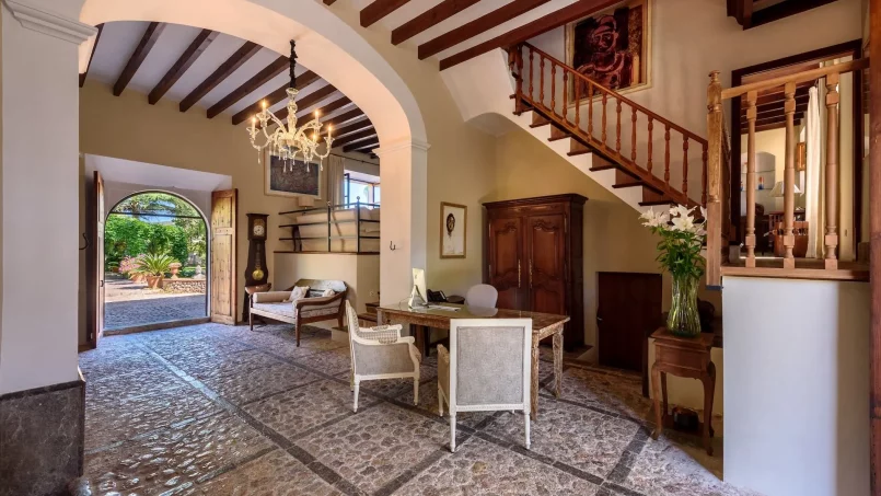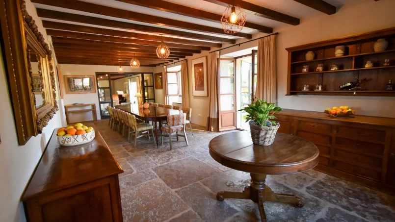 Las zonas comunes celebran la arquitectura tradicional mallorquina, con vigas de madera vistas, paredes de piedra y baldosas artesanales que añaden calidez y autenticidad. Las elegantes zonas de estar, con sofás y sillones de felpa, crean espacios acogedores para relajarse. Los interiores muestran muebles de madera meticulosamente seleccionados con tallas intrincadas, que realzan el encanto rústico de la finca. Amplios ventanales y puertas de cristal inundan de luz natural las zonas de estar, ofreciendo impresionantes vistas del paisaje circundante y de la majestuosa Serra de Tramuntana, combinando a la perfección los espacios interiores y exteriores.