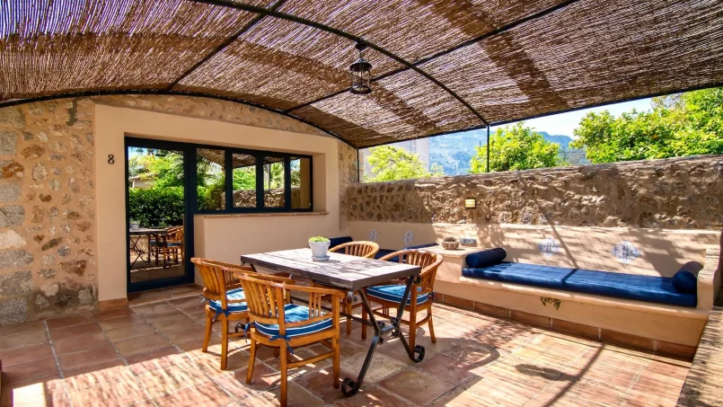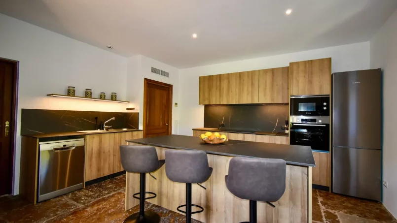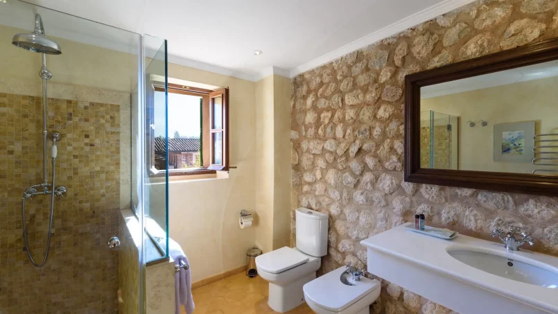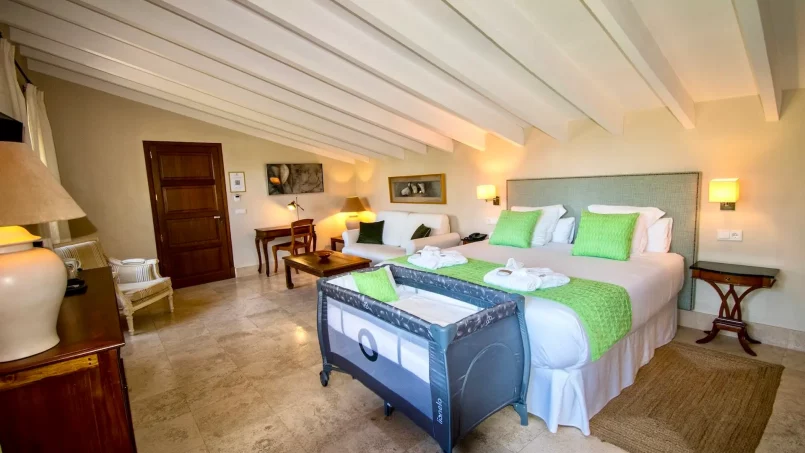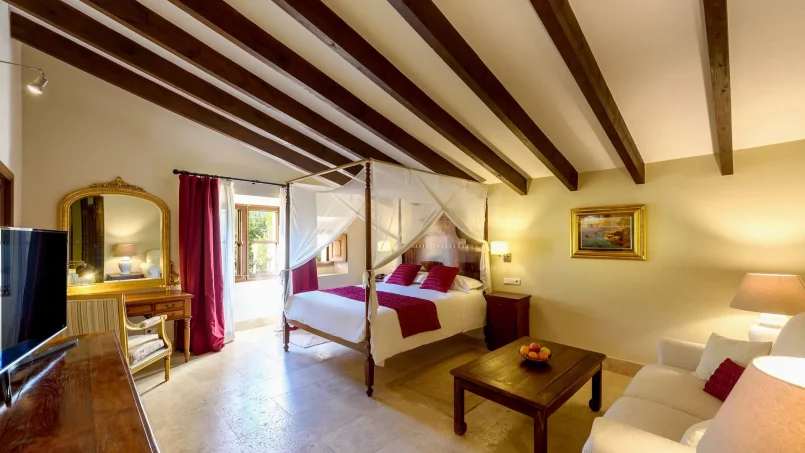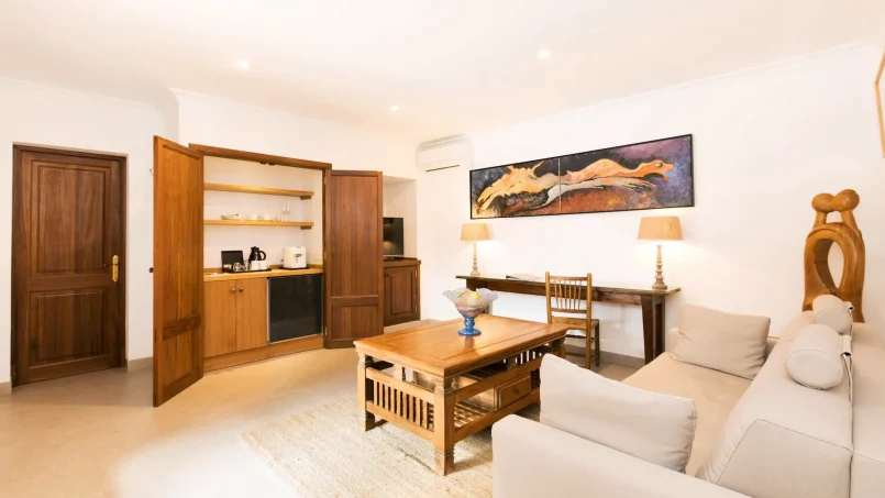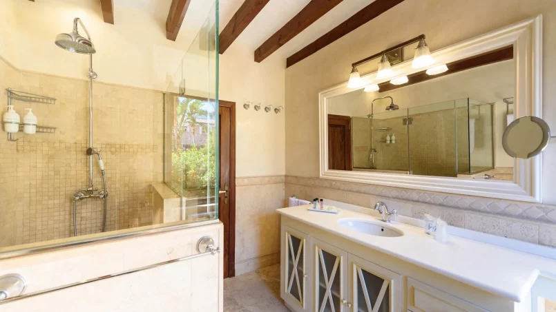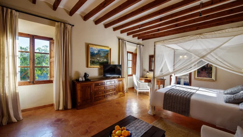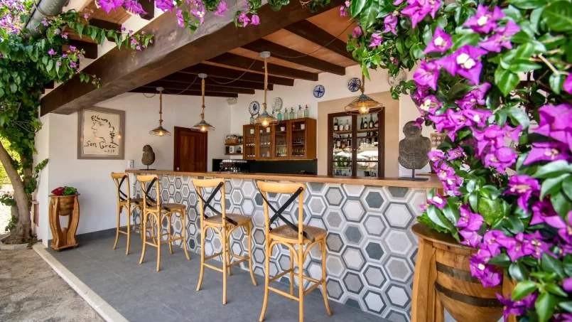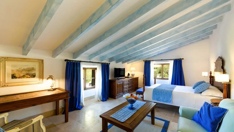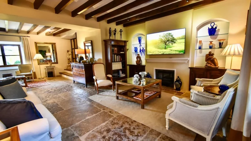 Las zonas comunes celebran la arquitectura tradicional mallorquina, con vigas de madera vistas, paredes de piedra y baldosas artesanales que añaden calidez y autenticidad. Las elegantes zonas de estar, con sofás y sillones de felpa, crean espacios acogedores para relajarse. Los interiores muestran muebles de madera meticulosamente seleccionados con tallas intrincadas, que realzan el encanto rústico de la finca. Amplios ventanales y puertas de cristal inundan de luz natural las zonas de estar, ofreciendo impresionantes vistas del paisaje circundante y de la majestuosa Serra de Tramuntana, combinando a la perfección los espacios interiores y exteriores.