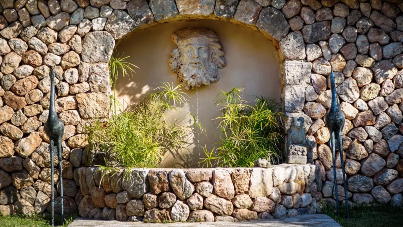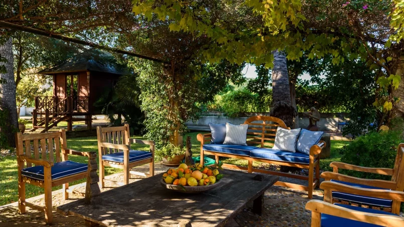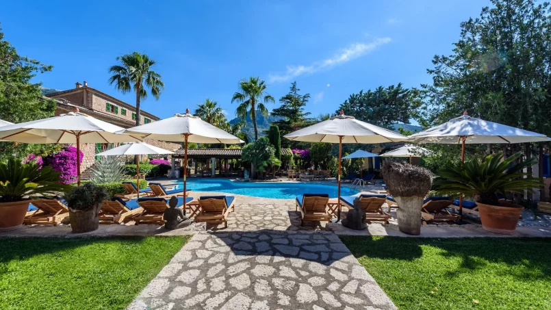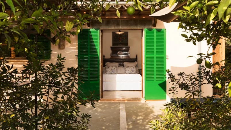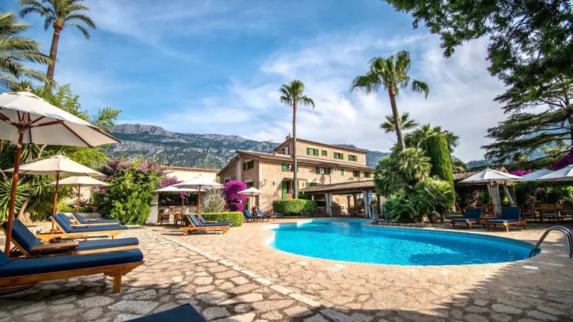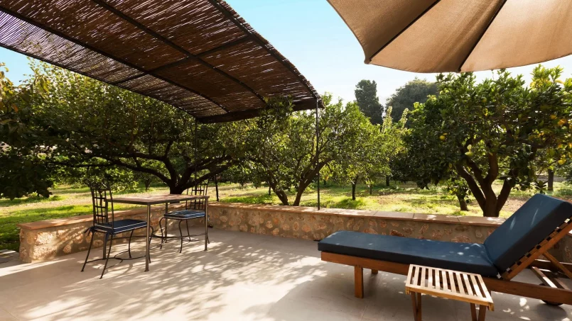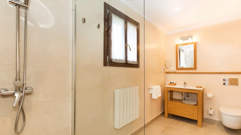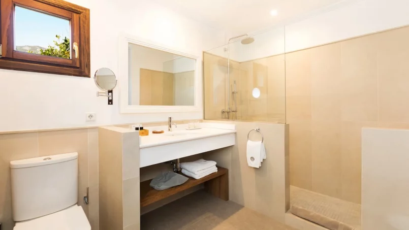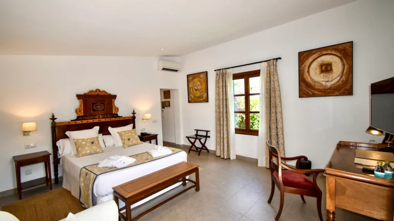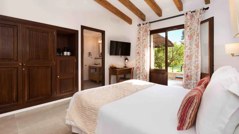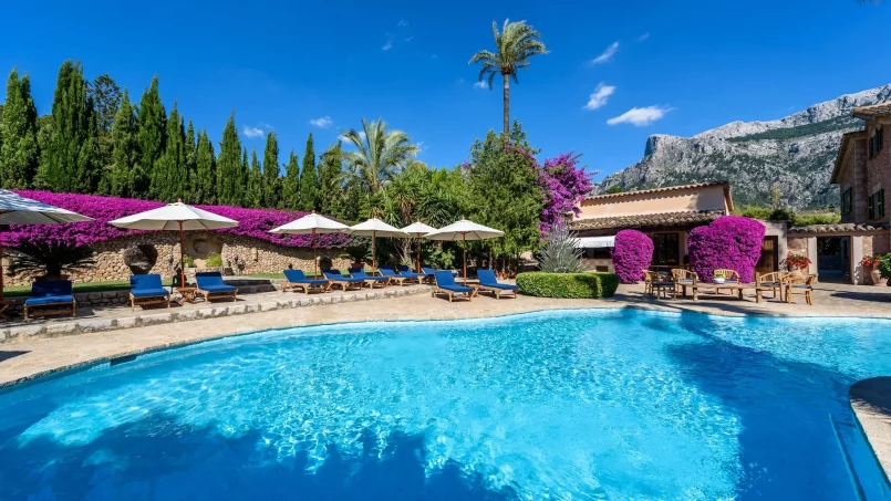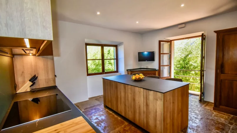 Las zonas comunes celebran la arquitectura tradicional mallorquina, con vigas de madera vistas, paredes de piedra y baldosas artesanales que añaden calidez y autenticidad. Las elegantes zonas de estar, con sofás y sillones de felpa, crean espacios acogedores para relajarse. Los interiores muestran muebles de madera meticulosamente seleccionados con tallas intrincadas, que realzan el encanto rústico de la finca. Amplios ventanales y puertas de cristal inundan de luz natural las zonas de estar, ofreciendo impresionantes vistas del paisaje circundante y de la majestuosa Serra de Tramuntana, combinando a la perfección los espacios interiores y exteriores.