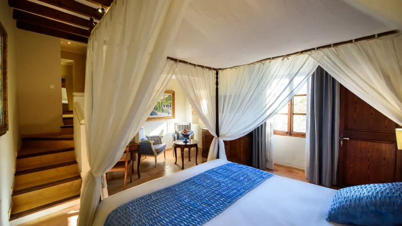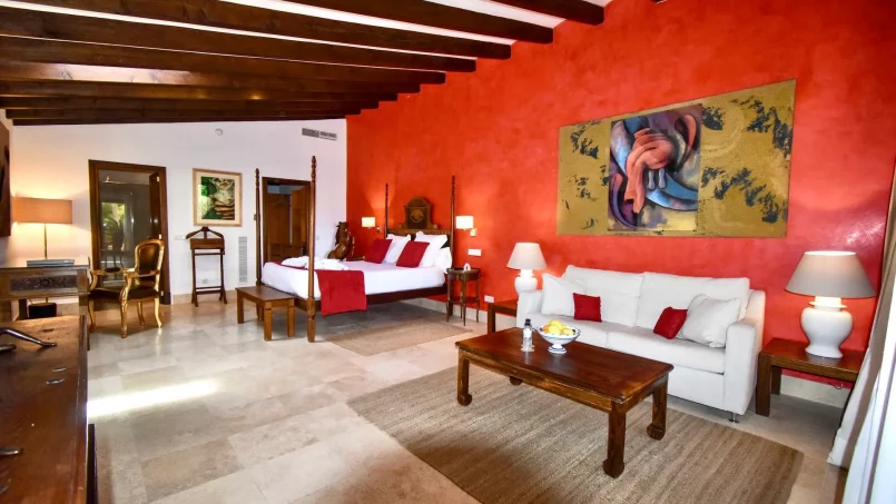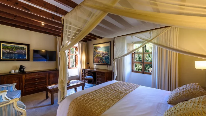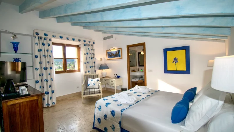 La propiedad tiene capacidad para 26 huéspedes en 13 habitaciones elegantemente amuebladas, con camas de madera y amplias suites con salones y terrazas privadas. Una de las habitaciones está adaptada para sillas de ruedas. Los alojamientos se dividen entre la casa principal y un anexo, todos con cuarto de baño privado. La villa está totalmente climatizada, incluidos todos los dormitorios y espacios comunes, y un ascensor da acceso a cuatro plantas de la casa principal.