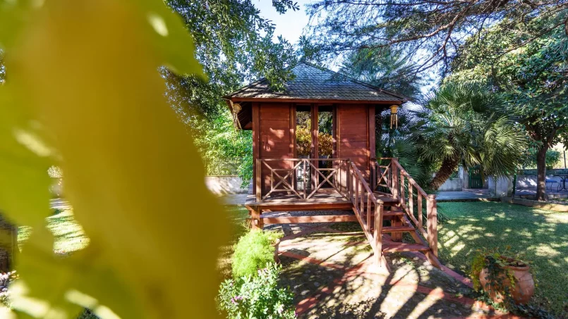 Pabellón comedor al aire libre junto a la piscina.