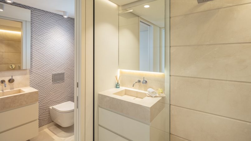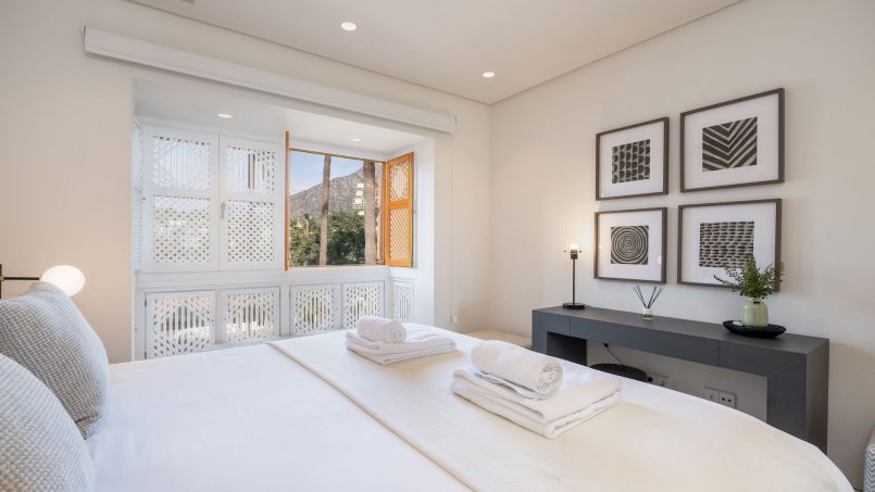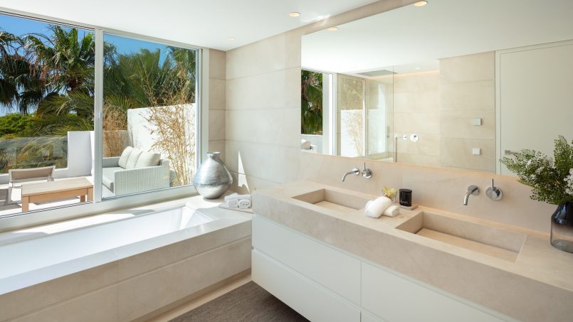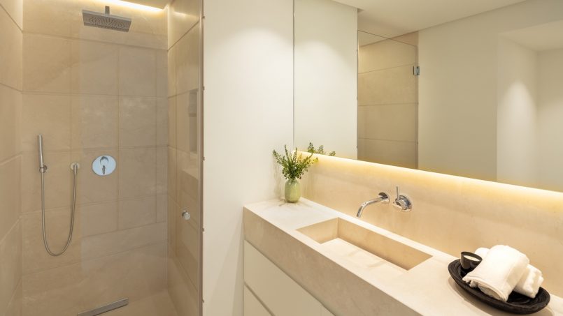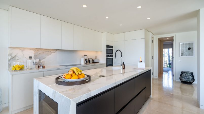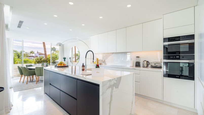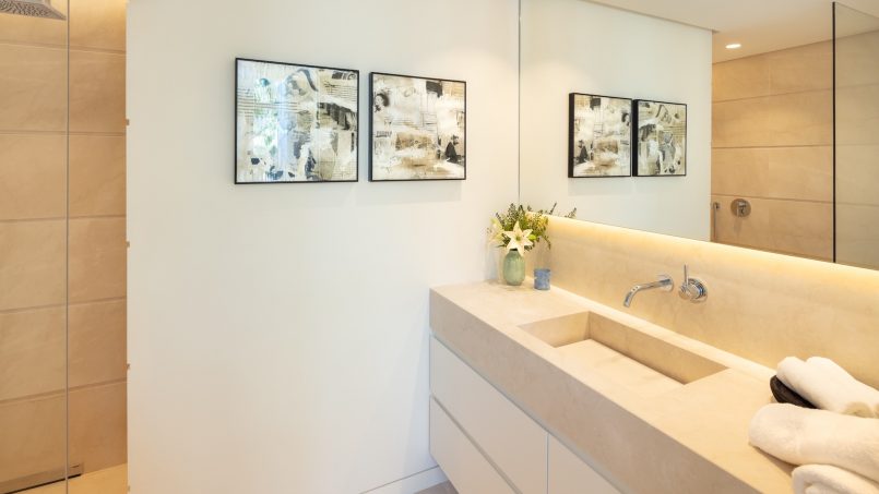The apartment caters for 8 guests, with 4 bedrooms and 4 bathrooms, a communal pool, on-street parking, a fantastic open-plan kitchen and dining room which looks out onto one of the terraces and has a sea view. Simply divine! Everything has been tastefully decorated so you can leave your cares at home, relax on the stylish cream sofa in the lounge while perusing a magazine of choice, or unwind in one of the huge marble bathroom suites.