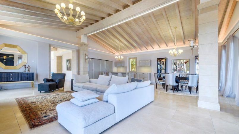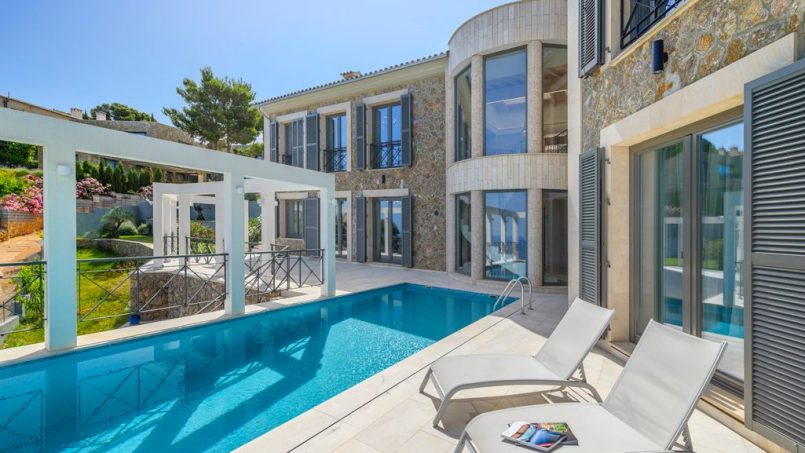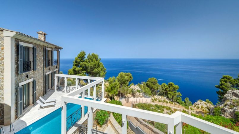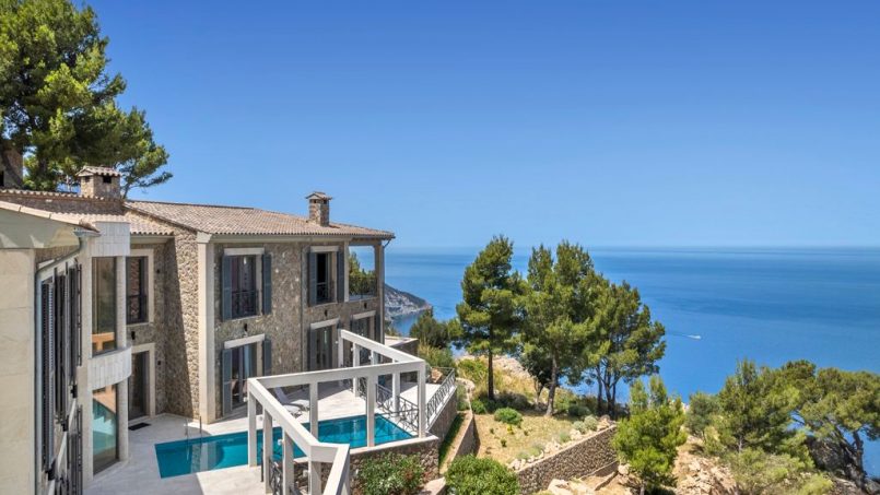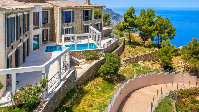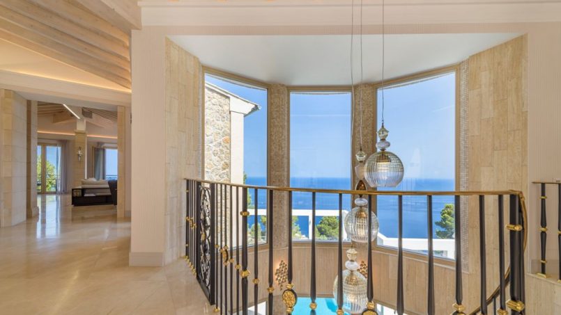 Located in a quiet zone just a 5-minute drive from the picturesque town of Valldemossa, we find this impressive villa with stunning sea views and sunsets all year round. The property was built recently, using the highest-quality materials and the most refined finishes. The upper floor has a large hall with huge luminous windows. It gives way to a great space hosting a sitting room, open kitchen, and dining room with access to a terrace from which one can admire the dazzling sea. This floor also has a spacious guest bedroom with en-suite bathroom, and a courtesy bathroom. The lower level contains two luxurious bedrooms and a relaxation lounge with spa. Both levels are connected by an elegant, broad marble staircase. Natural light floods this house and almost every room has direct access to terraces and swimming pool. It also includes an independent studio with its own entrance.
